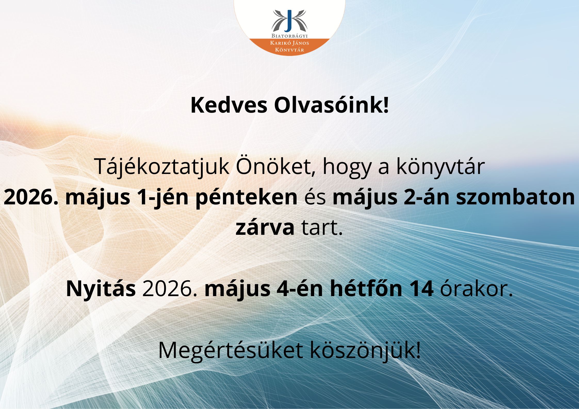 Tájékoztatjuk Önöket, hogy a könyvtár 2026. május 1-jén pénteken és május 2-án szombaton zárva tart.