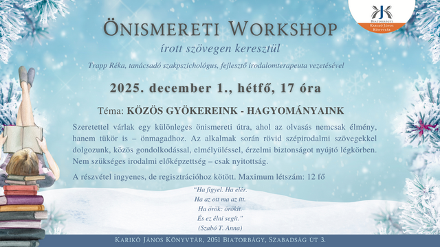Szeretettel várlak egy különleges önismereti útra, ahol az olvasás nemcsak élmény, hanem tükör is – önmagadhoz. Az alkalmak során rövid szépirodalmi szövegekkel dolgozunk, közös gondolkodással, elmélyüléssel, érzelmi biztonságot nyújtó légkörben. Nem szükséges irodalmi előképzettség – csak nyitottság.